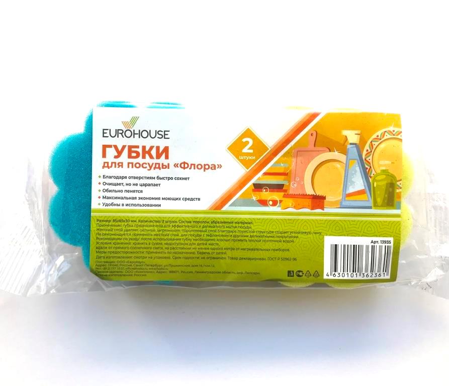 Губка кухонная д/посуды ФЛОРА (набор-2шт) 8.5*8.5*3см ЕвроХаус