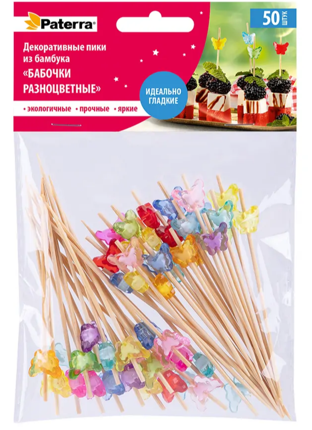 Декоративные пики из бамбука БАБОЧКИ РАЗНОЦВЕТНЫЕ (50шт) 90мм PATERRA