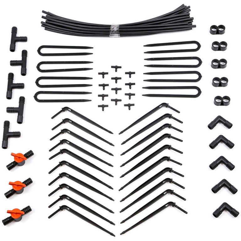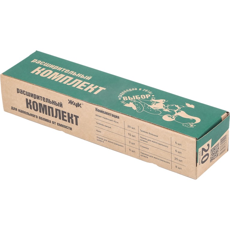 Комплектация: шланг подающий 40 см -20 шт, капельницы - 20 шт, тройник малый - 10 шт, кран - 3 шт, уголок для магистрального шланга - 5 шт, тройник большой - 5 шт, заглушка для магистрального шланга - 5шт, прижимы для магистрального шланга 8 шт.