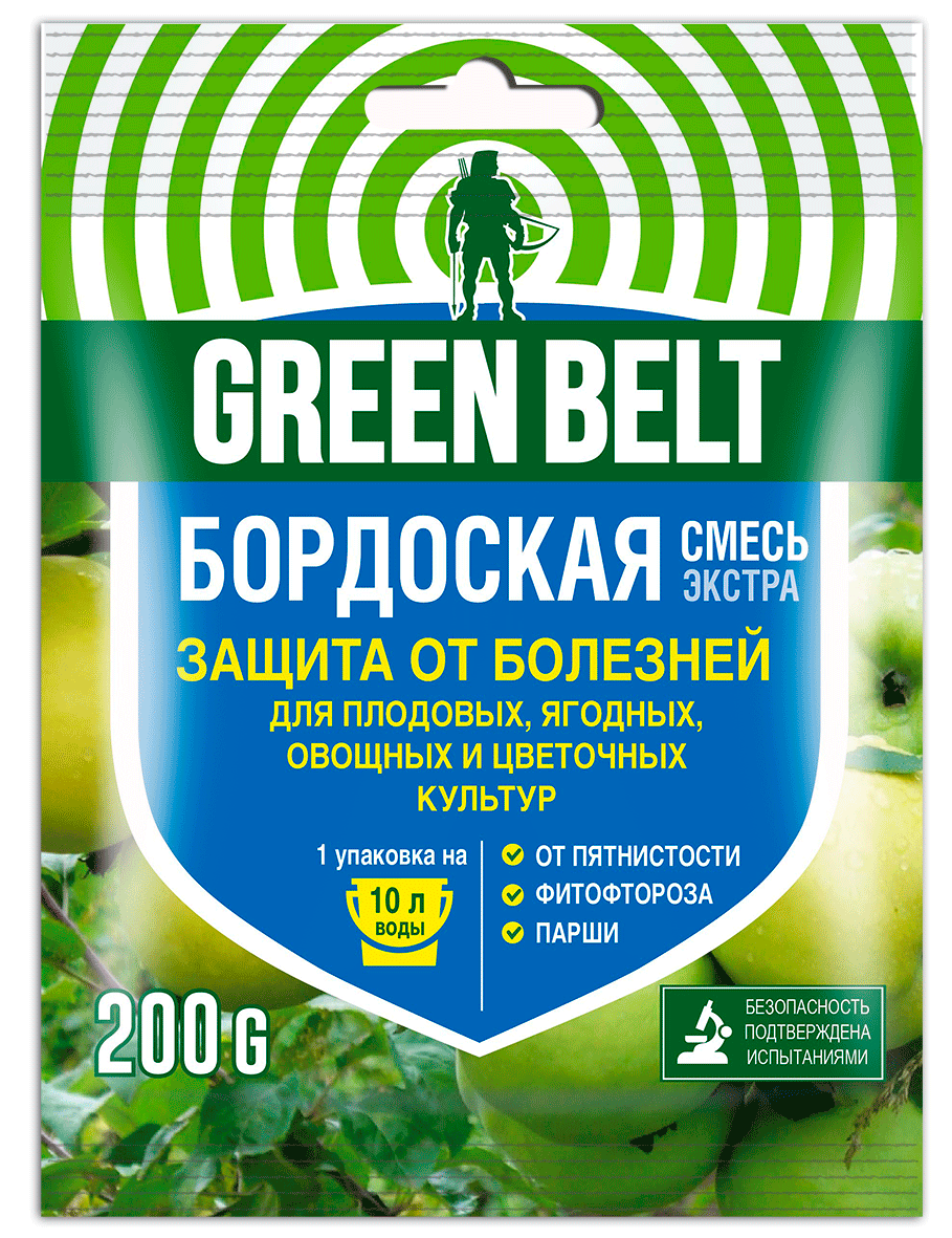 Действующие вещества – меди сульфат и кальция гидроксид. Компания «Техноэкспорт» производит фунгицид «Бордоская смесь» под брендом «Грин Бэлт» в пакетах по 100 и 200 грамм.