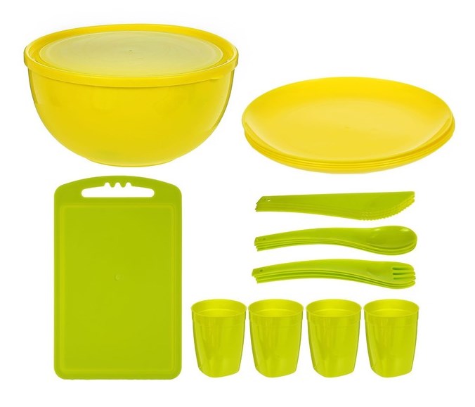 В набор входят: глубокая миска с крышкой, разделочная доска, 4 ложки, 4 вилки, 4 ножа, 4 тарелки, 4 стакана.
