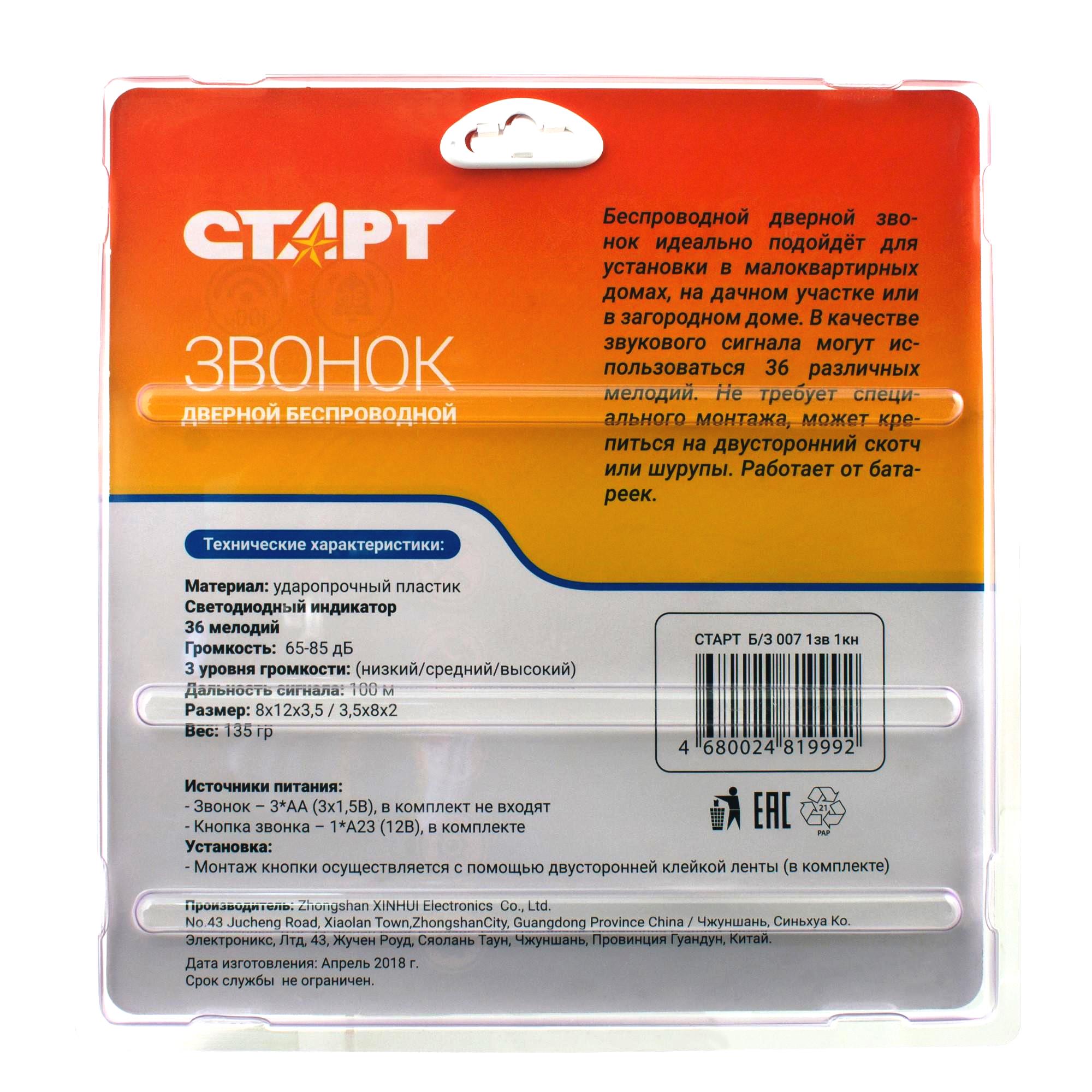 СТАРТ звонок 007 обладает прекрасными прочностными характеристиками. Их обеспечивает пластиковый корпус, надёжно защищающий устройство от разного рода негативных воздействий. Изделию не страшны ни падения с большой высоты, ни атмосферные осадки, ни даже контакты с агрессивными средами, типа щелочей и кислот.