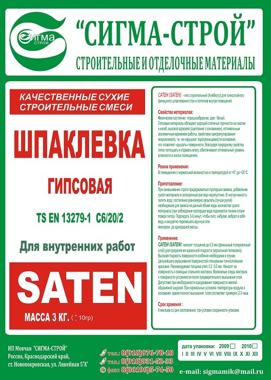 SATENTEK Шпаклевка гипсовая финишная 2кг (15шт/упак)