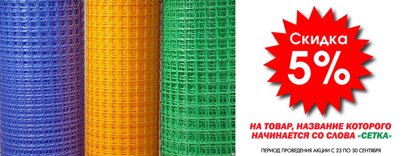 В акции принимают товары, название которых начинается со слова "СЕТКА". Покупатель получает на эти товары скидку 5%. Период акции ограничен. Акция действует